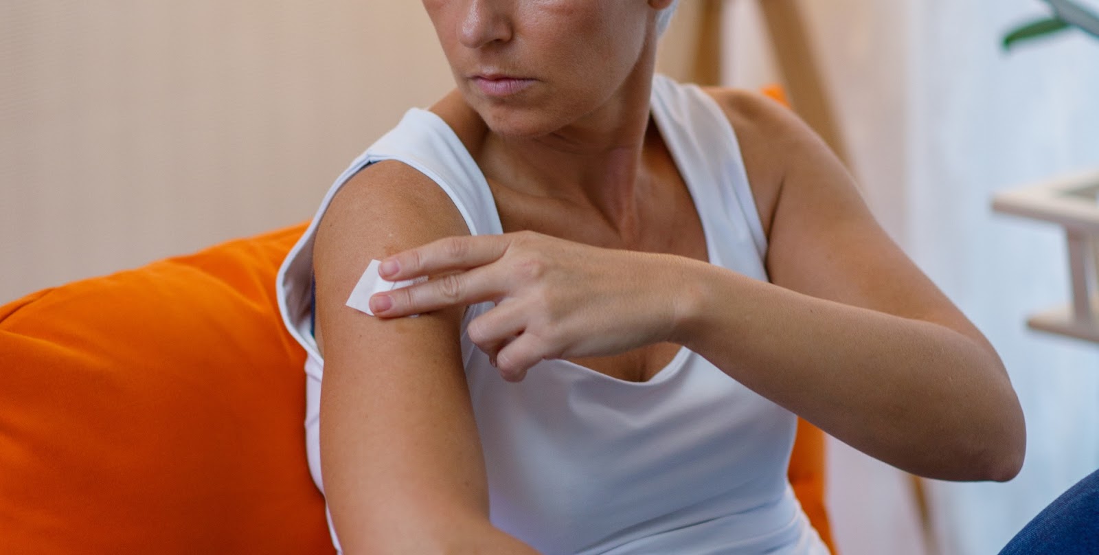 Bilde av dame som sitter og har tatt på østrogenplaster.